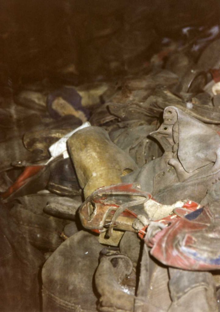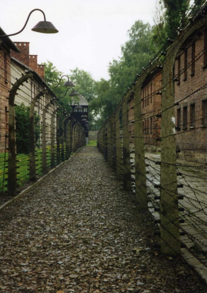 We got to Auschwitz about 10:50 and at 11 saw a Soviet film taken when they captured Auschwitz. The voice-over was in English and it was the usual awful pictures of emaciated living and dead. We then had a guide who in a monotone took us through part of Auschwitz which is set up to be a museum. There are photo exhibits and German documents and loads of artifacts that were left when the prisoners were murdered. There was a display in a case that held 2 tons of women’s hair. It was all the same color because the gas removed the pigment from the hair. The Soviets found seven tons of hair in bags ready to be shipped to Germany to be made into cloth (for interfacing). The cases for displaying the hair was one whole length of a room for 36-48 feet long. There was another room with cases on both sides of the room, the same length filled with shoes. The guide said that the best of the shoes and clothing was sent immediately to Germany and the rest was left (shoes) for later distribution. There were wooded shoes from Holland amongst the others – There was a pair of high-heeled shoes in navy, red, and white.
