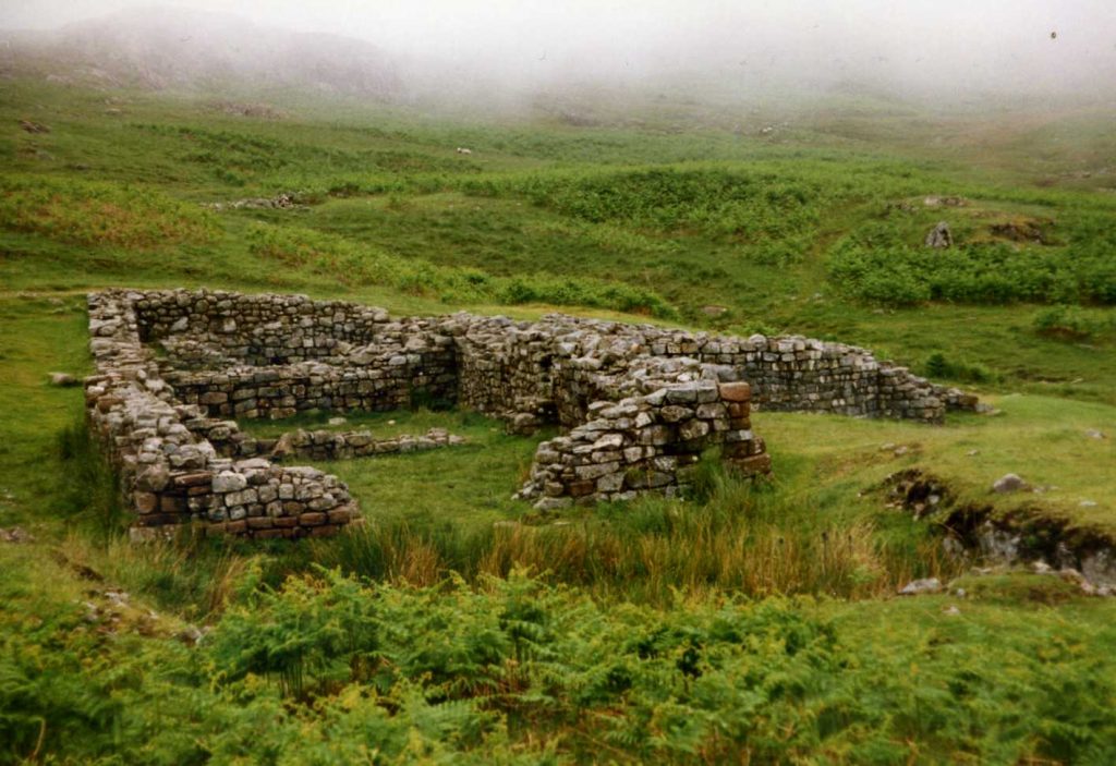 Hiked over moor to Seathwaite for lunch @ 1:30. Loads of sheep and stone fences. At Hard Knott Pass remains of Roman fort.