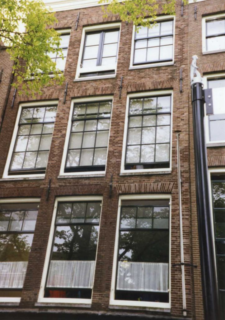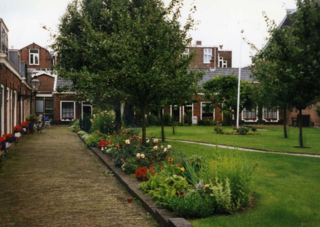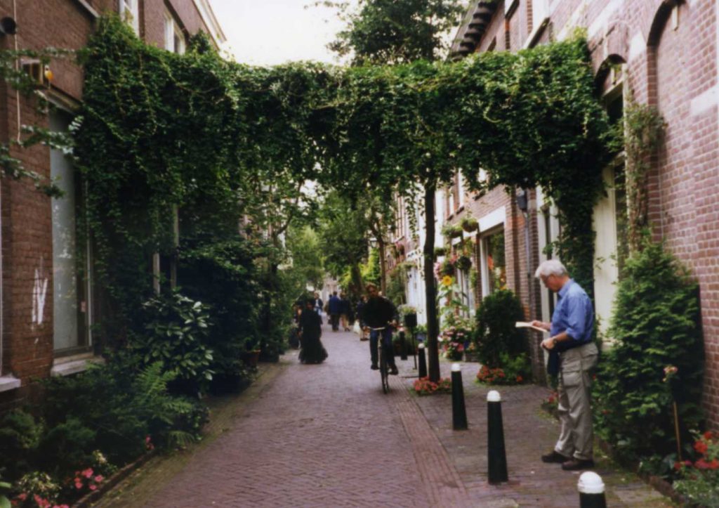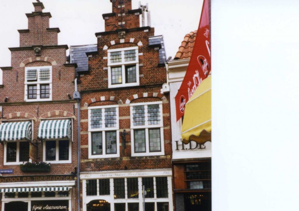 After arriving in Amsterdam caught a train to Haarlem. Walked. House narrow – had to go up to attic where there are three rooms and 1 toilet room. Had lunch on top of the department store and dinner at the Pancake place. After dinner walked around Haarlem. Old town, narrow, winding streets. Saw cute red-light house and beautiful steeples. Lots of old alms houses. Before dinner we slept due to lousy sleep on train. Couldn’t see any alms house courtyards (hofje). They close their big doors (gates) at 5:00. Saw one quilt store – will try to go back tomorrow.